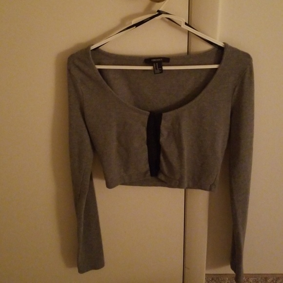 Adorable Forever 21 grey and black crop top with hook eye front closure and long sleeves