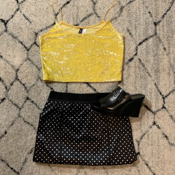 This buttercup velvet crop top is super cute to pair with any spring summer look.. I like the true spaghetti strap detail. It is from H&M size medium. Fits true to size. Can wash cold water and tumble low :)