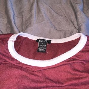 Rue 21 Maroon short shirt with white edging. Slight color faded in front but not too much. I’ve had for a few years but haven’t worn it much.