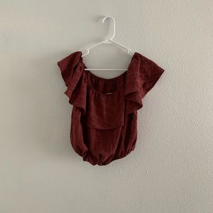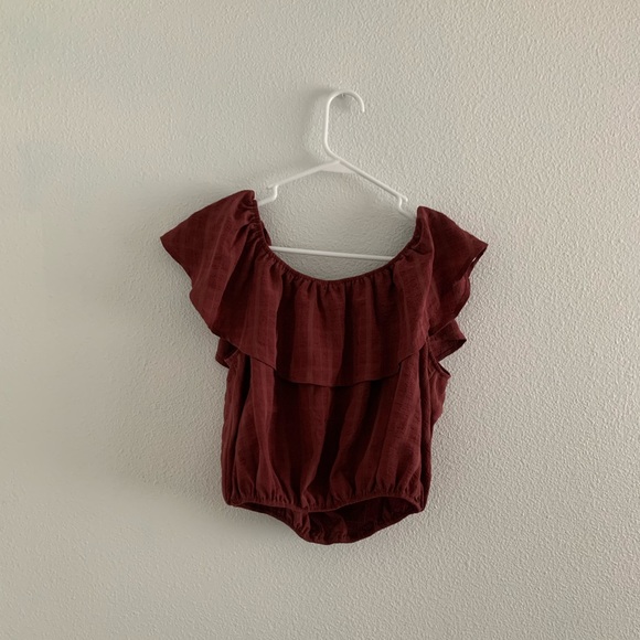Cute settle ruffle top. It is cropped and you can wear it off the shoulder. Nice thick material!