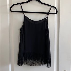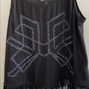Black crop top with “bow” front design in beads. Fringed bottom. Loose fitting