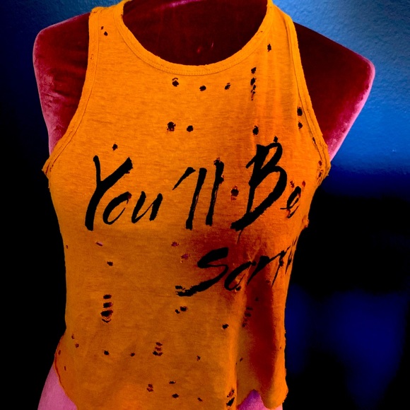 Crop top with holes in it saying you’ll be sorry. Cute shirt for night time