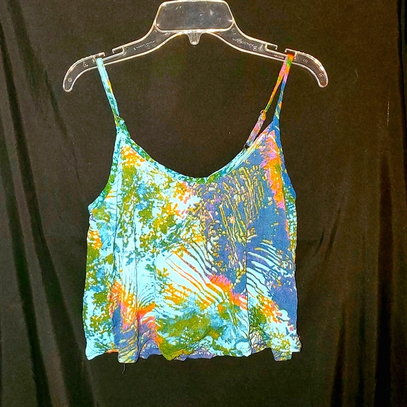 Skinny strap, flowy, crop top. Multi colored, mostly dark and light blue, with some green and orange. Straps are adjustable. Buttons in back at neckline, with wood toggle, and had keyhole. Barely worn. Machine washable.