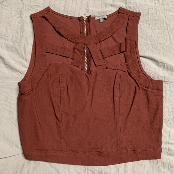 Crop top with cut outs at the top. It is padded/built in bra (light padding)