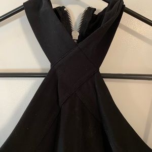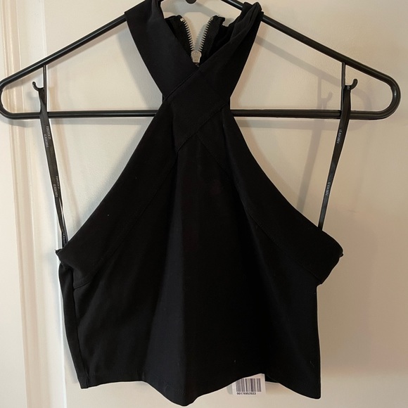 Womens size medium black crop top. Never been worn. NWT. Cross in the front of the neck with silver zipper in back.