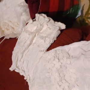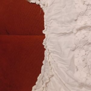 white short sleeve croped top with lace design on chest and sleeves elastic round neck.