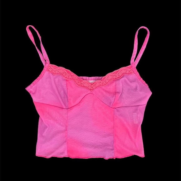 Purple and pink little sheer top that’s cropped with a lace trim