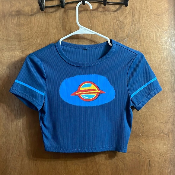 Yellow and red planet close fit crop top