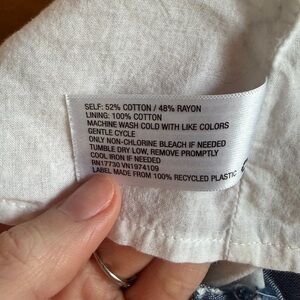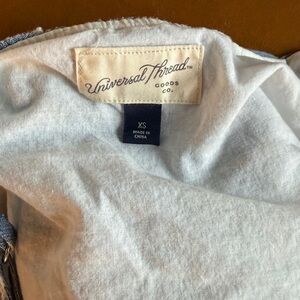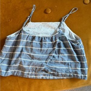 Blue with small white stripes. Lined inside. Wraps in the back. Spaghetti straps and a cropped boxy silhouette. Cotton and so comfortable. Purchased at Target.