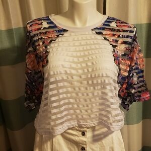 Xhilaration white burnout striped crop top featuring box design, scoop neck and floral printed sleeves.
