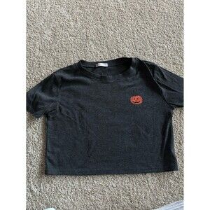 crop top with dark lettering saying "current mood" surrounding the pumpkin