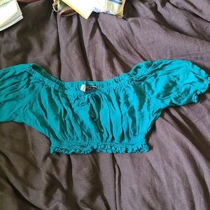 Gorgeous teal, cotton with elastic top and bottom. Got it for ren Faire which we haven't gone to in over two years because of covid. Perfect for busty girls too!