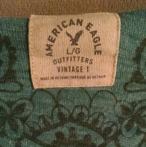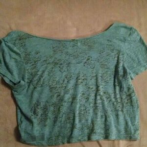 This is cropped and falls off the shoulder. Very comfy and soft. Brand new never worn. Blueish green.
