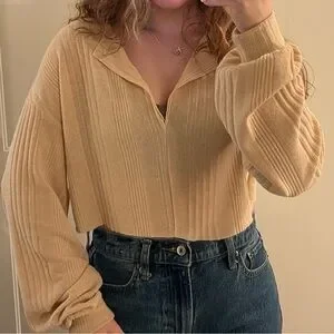 Lightweight ribbed top with a relaxed cropped fit. Soft beige color and a small collar. Perfect for pairing with high-waist jeans.