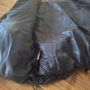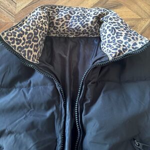 The short, cropped version of the puffer jacket, hits above the hips. This jacket has been upcycled, and a genuine soft Suede leopard print collar was added, making it a one-of-a-kind. It has a warm lining to keep you toasty all winter.