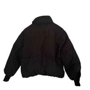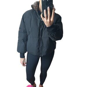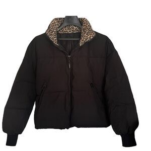 Cropped Black Puffer Jacket Soft Suede Leopard Print Collar Ribbed Cuffs Urban