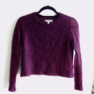 This mohair and wool cropped sweater is trendy with a boxy fit. It's extremely warm without being too scratchy, AND it comes in your favorite color: wine. Worn only a few times, this is a great fall-to-winter piece. Layer with a crisp button down or wear alone with a high-waisted circle skirt!