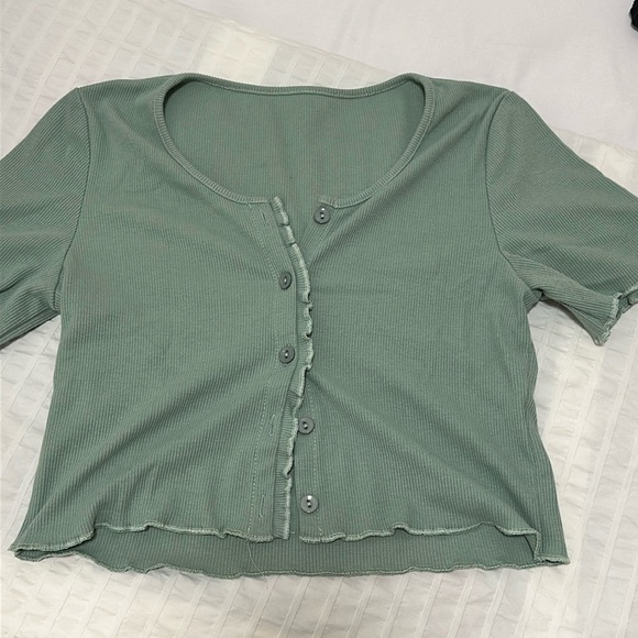 - cropped fit - button details - no size detailing but fits small/medium