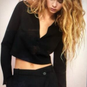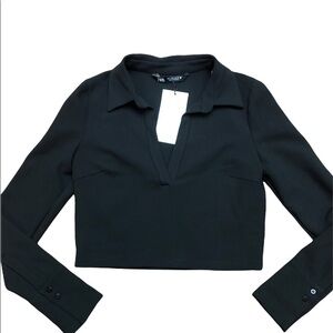 Solid Black Collared Deep V-neck Long Sleeved and Buttons at Sleeve Cuffs