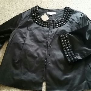 This is a satiny, black, ellegant jacket. You can dress it up with a dress and heels for going up or skinny jeans and booties