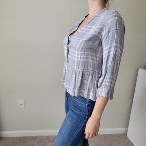 New without tags cropped flannel shirt with 3/4 sleeves (one button on each sleeve) and gold string detailing throughout shirt. Relaxed fit at the waist.