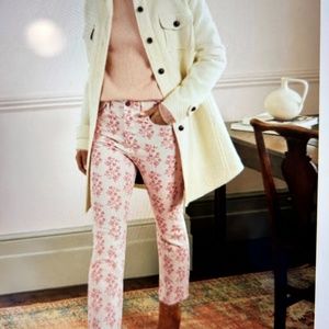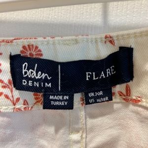 Cropped flare Jean, stretchy material, ivory colored with red leaf pattern. Perfect for summer! From Boden. Only worn once. Cotton. Machine wash. Size 16/18.