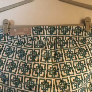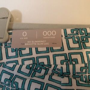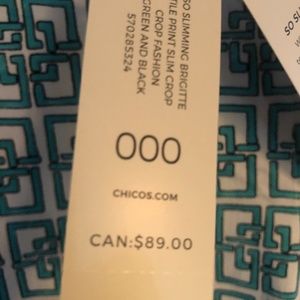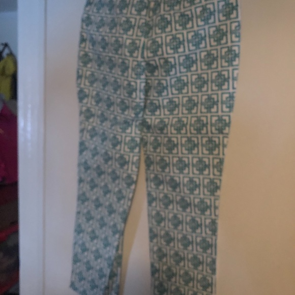 Cropped, mid weight, pull on pants. Tummy control. Very comfortable and moveable. Rayon/Spandex/Cotton blend. Aqua/White/Black design.