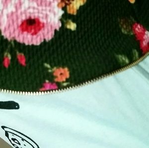 Adorable, cropped, green floral jacket. Softer, relaxed, puckered knit with faux, gold zipper edge. Ruched, 3/4 sleeves. Hangs open, no closure. Fits true to size. Polyester/spandex. Made in USA.
