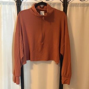 Add a touch of style to your casual outfits with this rust-colored cropped sweatshirt. The half-zip design offers both comfort and flair. One of the softest sweatshirts you’ll ever wear!!