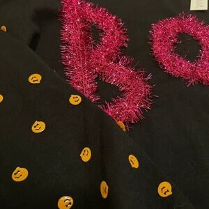 Enter spooky season in this adorable cropped Halloween sweatshirt, featuring bright orange pumpkin polka dot sleeves and bold pink tinsel “Boo!” lettering across the front.