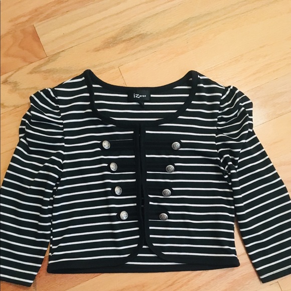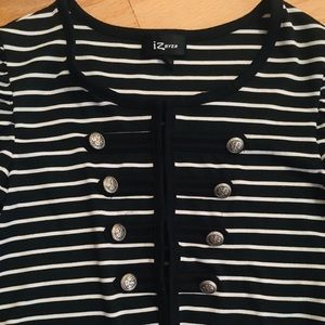 Black and white striped mini jacket with ornate buttons.