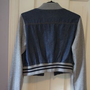 This jacket is cropped, comes about halfway down the torso and is lightweight. Has a "denim" look. It is a juniors large and would probably be a small in women's. 70% cotton, 28% polyester, and 2% spandex.