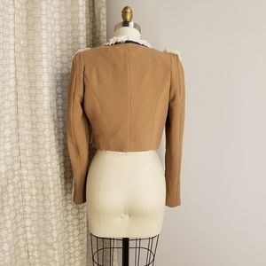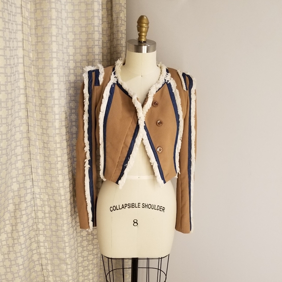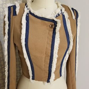 Lucy & Co button front cropped jacket. Fringe detail along with chambray twill detail. Jacket is fully lined in satin, and outer is a tan crepe material. Does have a small spot of back, but is not noticeable when wearing.