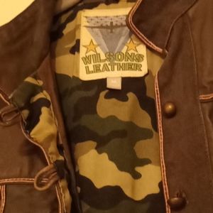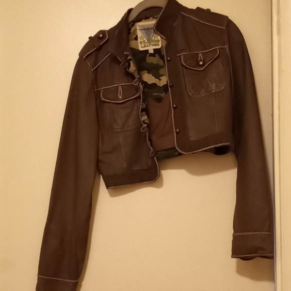 Olive green cropped jacket. Camo inside. Good condition. One loose button.