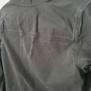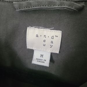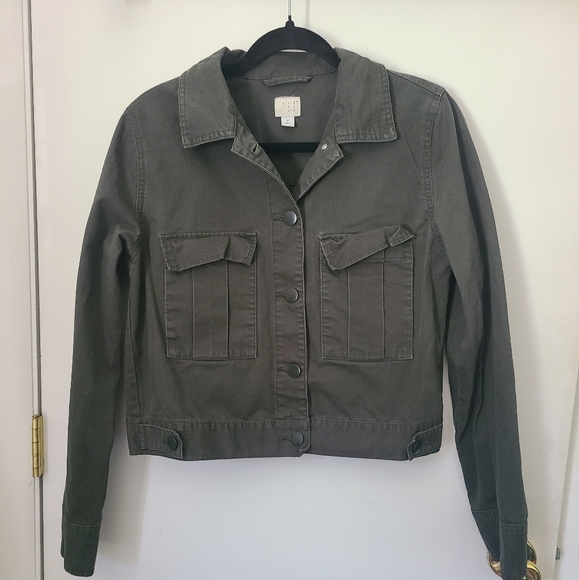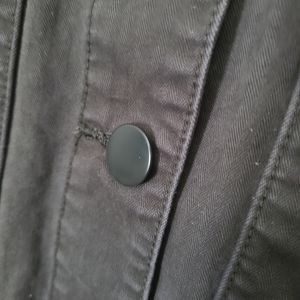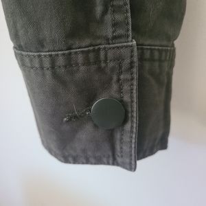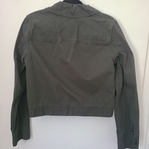 Lightly worn! Cropped. 5-button closure. Button closure on both sleeves. Button detail on left and right bottom sides (non-functional). Tall, functional front pockets. Minimal stretch.