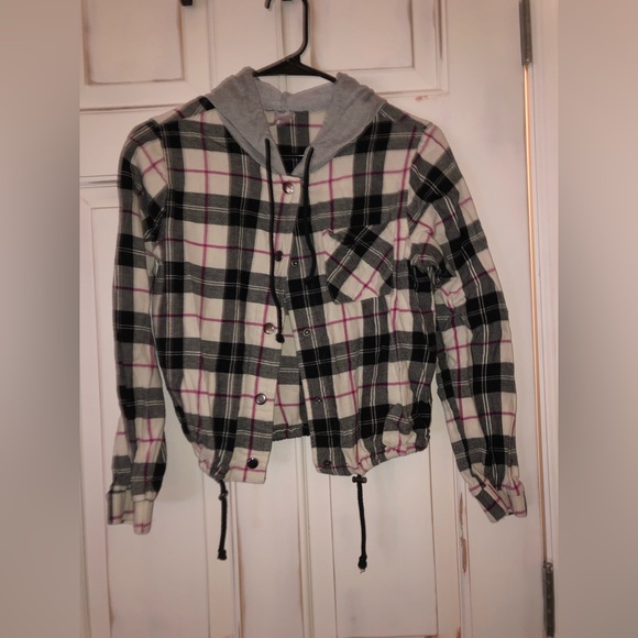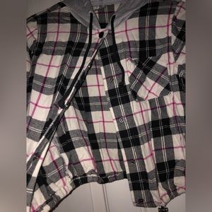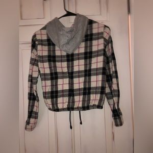 Color: Black, white and red plaid with a grey hood.