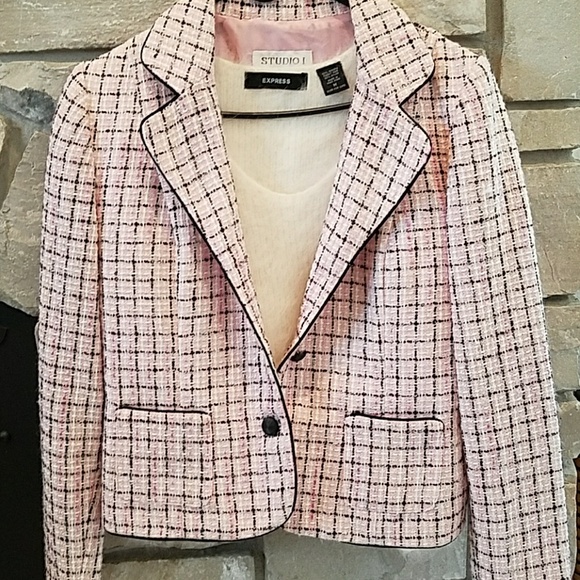 Pink and black cropped dress jacket. Has a tweed like texture and is accented with black piping. 2 small front pockets and 3 black button closure. Includes the Angora sweater for layering. White/Cream from Express.