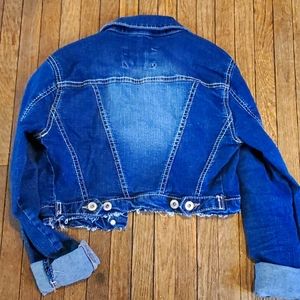 Medium to dark wash cropped jean jacket. Size small. Super cute with a summer dress and sandals! Worn well but still in like new condition. The material is decently thick but still has some stretch to it.
