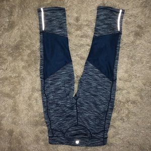 Cropped workout leggings. Mesh cutouts on the back of the legs.