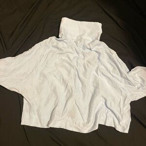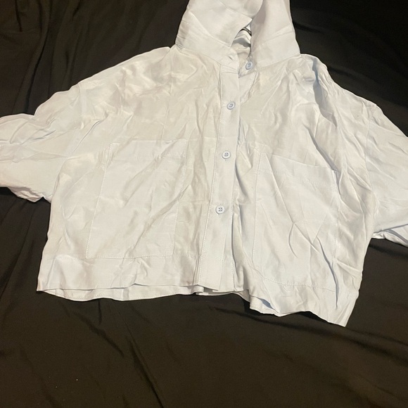 Cropped button-front top . Front patch pockets and short sleeves. Soft light color and relaxed fit. Clean, simple styling for casual wear.