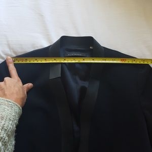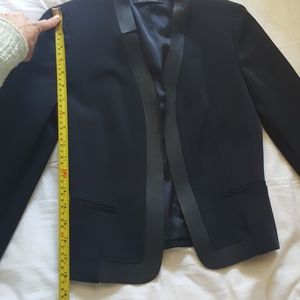 I got this for work but soon quit my job. It is a beautifully made fitted, cropped blazer with full length sleeves and leather trim from Elie Tahari. Size 0. The material is thick and unique-- almost feels like nylon.