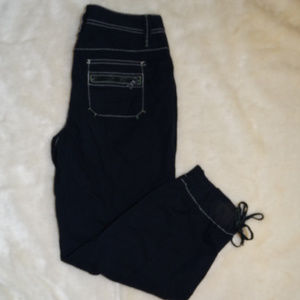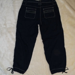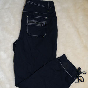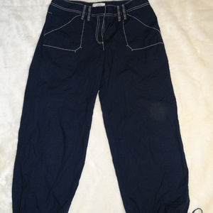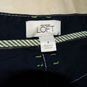 This is for a cute pair of Ann Taylor Loft cropped pants in a dark navy blue color with green and white stitching. They are size 4 and style Marisa. They are 98% cotton and 2% spandex. They have a zipper and snap button closure in front along with a hidden side button for the front enclosure. They have two front pockets, two zippered pockets in back and gathered ends (at the bottom of the legs) that tie. Measurements: 32.5" measured waist, 32.5" long, 25" inseam. The pants also have belt loops