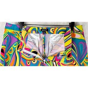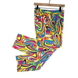 Cropped pants by Metrostyle in stretch cotton. Muti color print in "mod" design, retro 60's/70's look. Front zipper, back pockets, small pleat at hem. Very good overall condition, but there is a small bit of color bleeding in one spot, note attached picture.