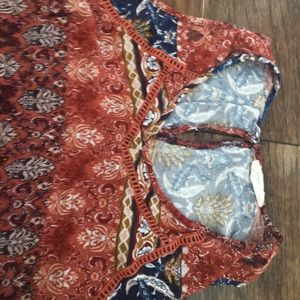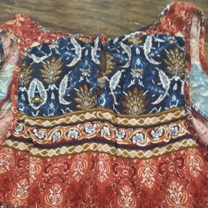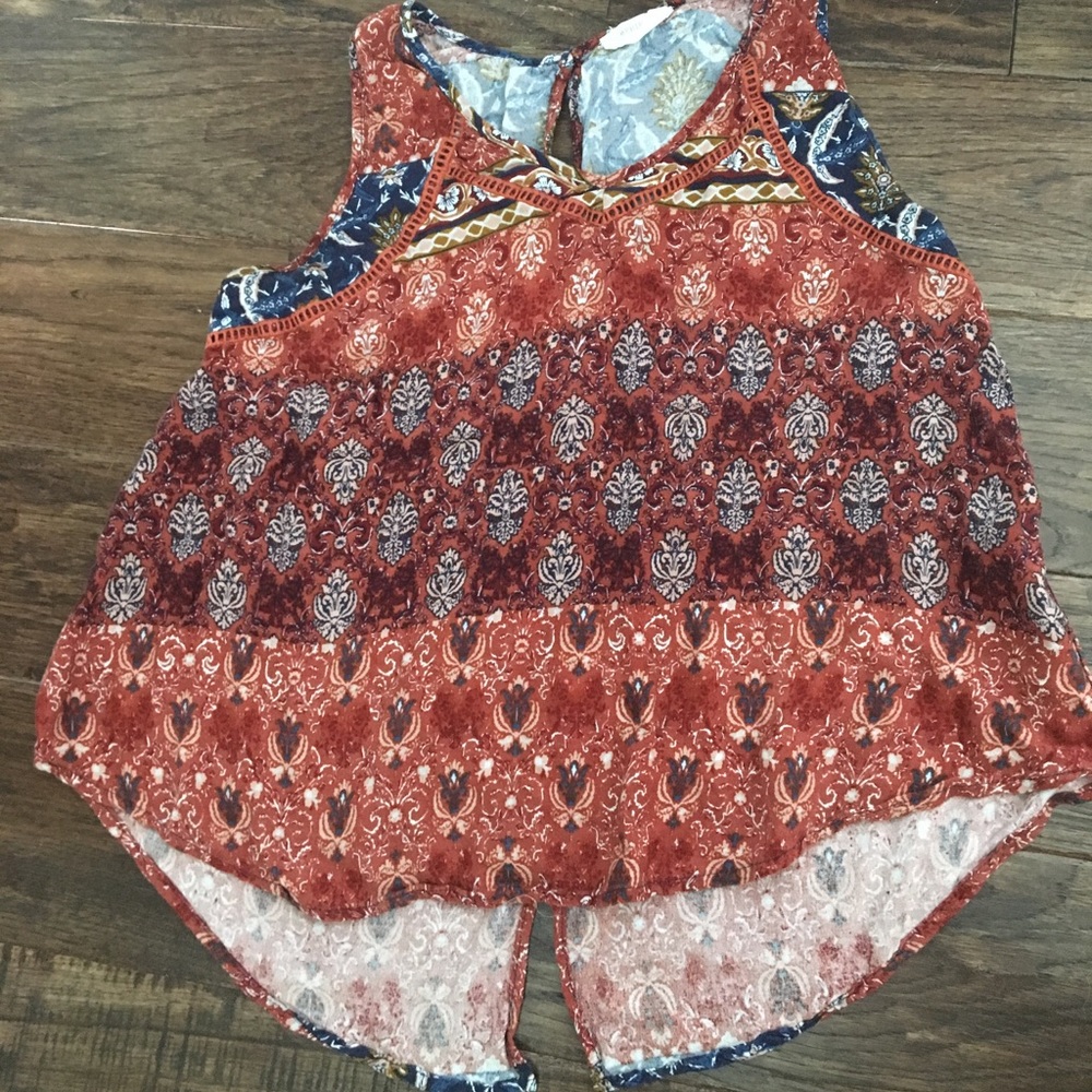 v-neck, orange and blue, cropped tank with cutout detail at neck. cutout with button on back. excellent condition. womens M