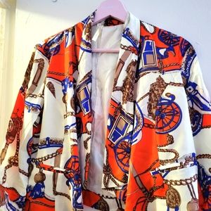 Orange, blue and cream color, dressy cropped jacket. Fits perfectly with a cami or dress. Can dress up or down to your liking. it hits slightly above the waist so not too cropped. great material.