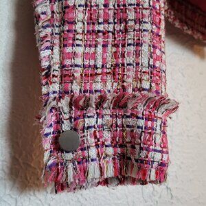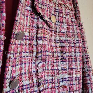 This adorable pink and purple woven jacket is cropped to perfection and ready for a brisk adventure, coffee date, or a day in the office. It is complete with stainless steel buttons and two front pockets. Elle Woods (from Legally Blonde) would approve.