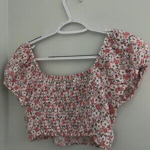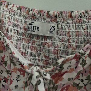 Hollister crop top in size XSmall. Features a pink and white floral print, puff sleeves, and a ruched tie front. Super cute for spring and summer!