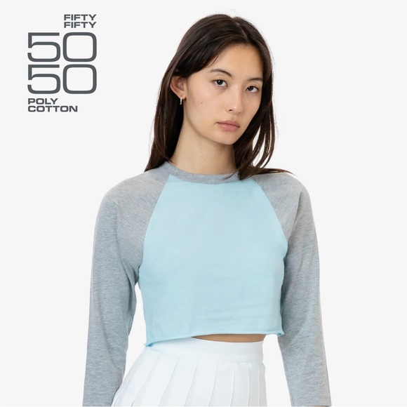 This cropped, 2-tone raglan is made from one of our classic textiles - our 50/50 poly cotton is lightweight and versatile. This style features 3/4 length sleeves and a raw-finished hem. Pair this sporty top with our tennis skirt or denim shorts for casual style.