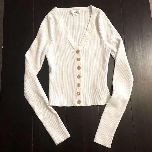 Great condition! Only worn a few times. Slightly cropped, button front, stretchy rib fabric.