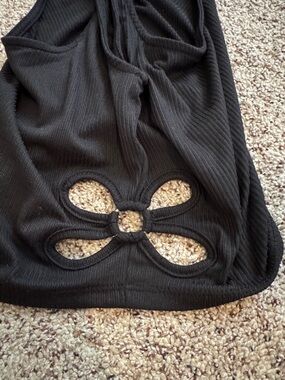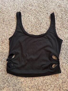 Black ribbed tank top with side cutout details. Designed for a sleek, versatile look that layers easily. Soft stretch fabric provides comfortable, all-day wear.